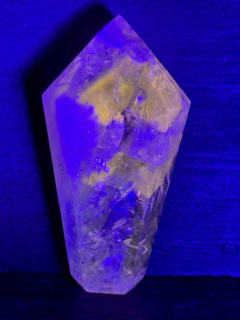 Ce qui rend cette améthyste véritablement unique est sa fluorescence sous lumière ultraviolette (UV). Sous cette lumière, le cristal s’illumine d’une aura captivante et vibrante, révélant une facette cachée de sa nature. Ce phénomène rare en fait une pierre recherchée par les passionnés de minéraux et les collectionneurs.