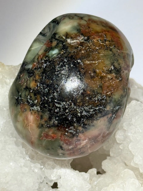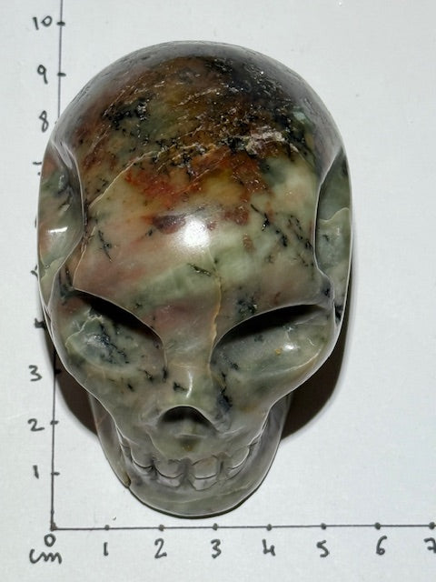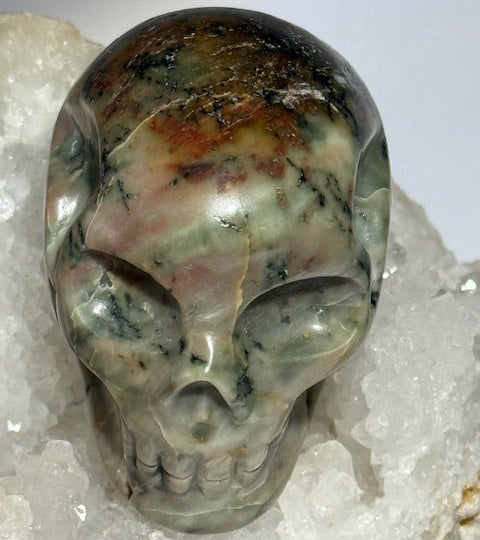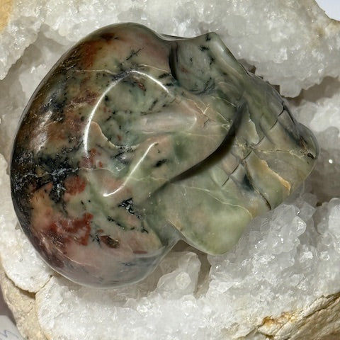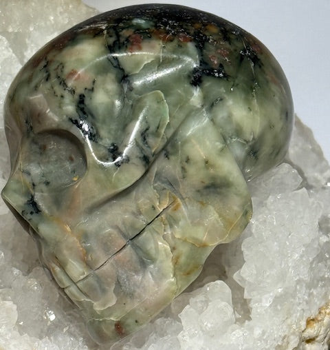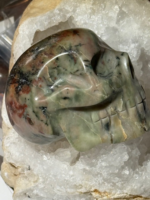 Sculpté dans cette pierre exceptionnelle, ce crâne devient bien plus qu’un objet : c’est un véritable réceptacle énergétique. Dans de nombreuses traditions, le crâne représente la mémoire ancestrale, la sagesse spirituelle et l’expansion de conscience. Il agit comme un portail vers la compréhension intérieure, un allié puissant pour les rituels de transformation.