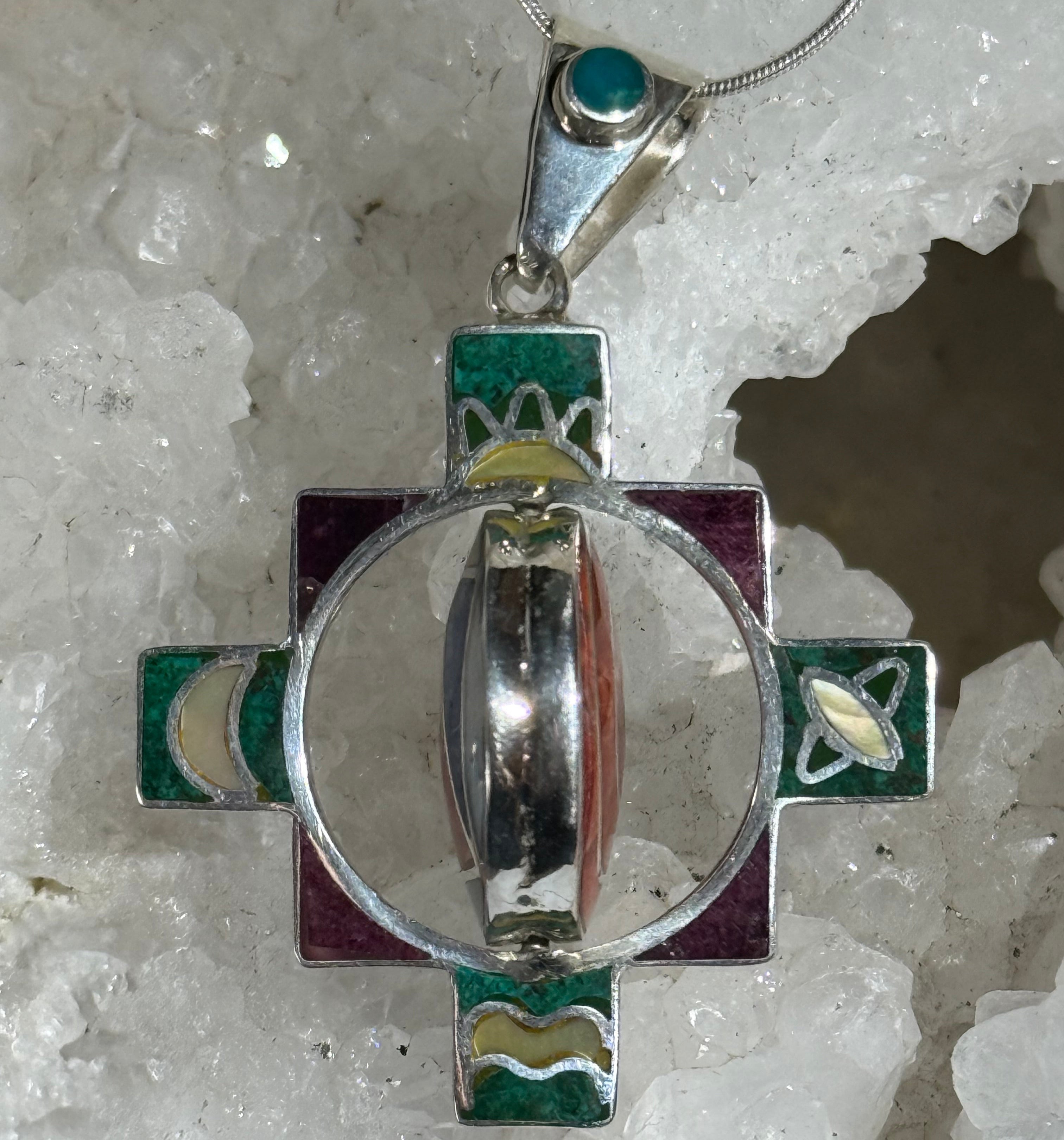 Artisans from the Cuzco region still craft stone Chakanas today, adorned with sodalite, mother-of-pearl, spondylus, and turquoise. These inlays, created using the cloisonné technique and separated by fine layers of silver, blend ancestral tradition with contemporary beauty.
