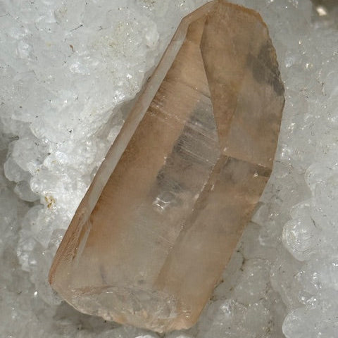 Tangerine Lemurian quartz is a vibrant, energizing crystal with a warm, luminous hue ranging from soft orange to coppery red. Its distinctive color results from iron oxide deposits formed during the later stages of its growth, giving this quartz a unique energetic signature. It combines the ancient wisdom of Lemurian crystals with a joyful, passionate, and transformative energy.