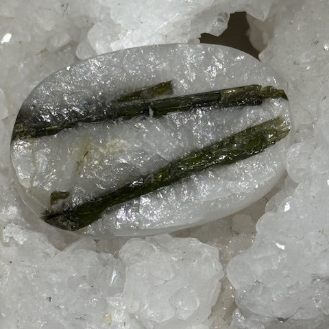 A highly sought-after natural pairing, green tourmaline (verdelite) set on quartz unites two complementary forces: the regenerating vitality of tourmaline and the amplifying purity of quartz. Visually, this combination often reveals beautiful green crystal rods — sometimes translucent, sometimes deeper in tone — anchored within a base of clear quartz with crystalline brilliance. Each piece is unique, like a mineral scene frozen in time, expressing a rare balance between life force and stability.