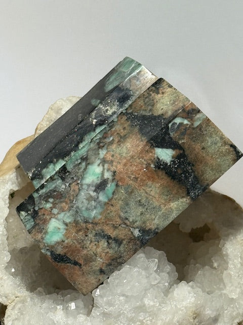 Et le béryl rouge, également appelé bixbite, pierre de passion et de courage, dont les inclusions rouge framboise se mêlent subtilement au vert profond du cristal hôte.